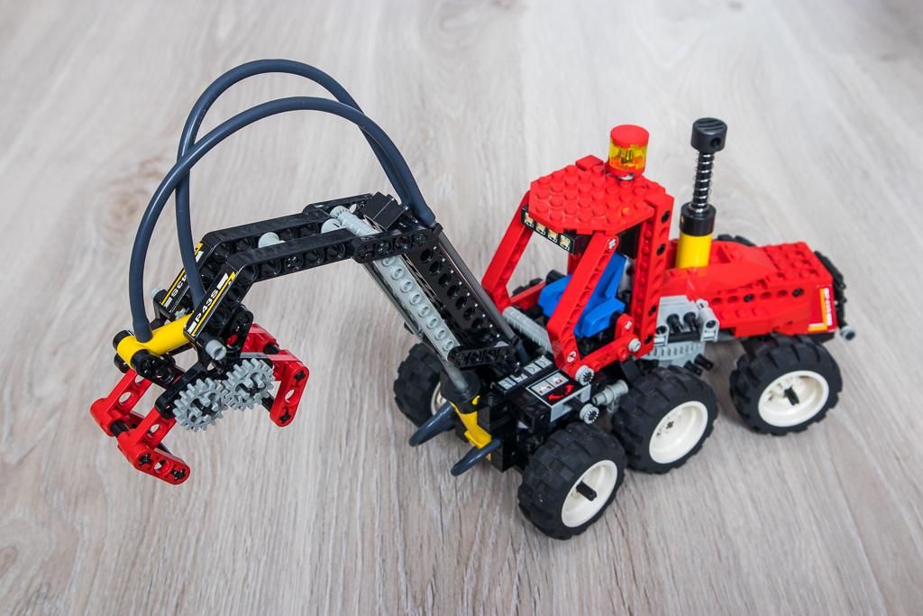 This is an article about the classic 8443 LEGO set of a forest tractor released originally back in 1996 towards the end of the studded Technic era. We can see a very nice design with a lot of red parts, 6 wheels and a grappling arm.